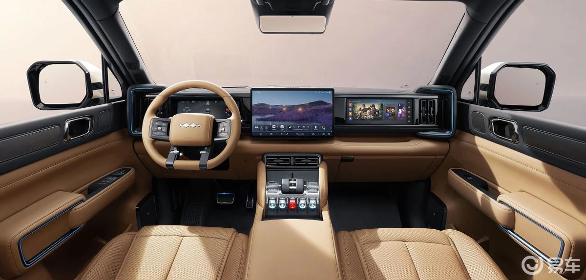 坦克300 Hi4-T采用传统布局,12.3英寸仪表+14.6英寸中控屏搭载高通8155芯片,支持HUAWEI HiCar、四区域语音控制、手机控车、车载KTV等功能,并保留部分实体按键,操作高效。Nappa真皮座椅支持主驾8点按摩与记忆迎宾功能,前排通风设计提升舒适性。标配的L2级驾驶辅助具备高德地图、遥控泊车、循迹倒车等功能,但没有提供领航辅助功能,科技感与智驾功能上略逊一筹。