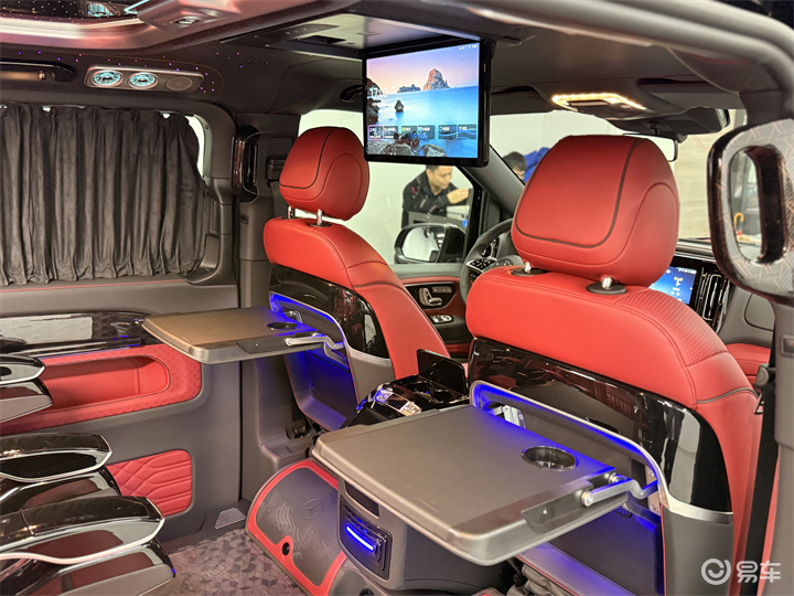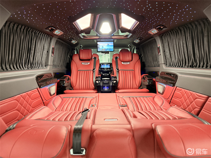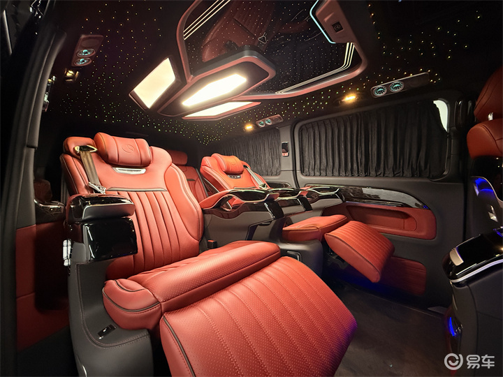 进入到车子内饰,所有能看到的地方全部都是升级改装之后的状态,驾驶室导航的中控中央扶手冰箱以及整体的包覆,后面的商务舱,航空座椅加沙发床,都是单独更换了的。包括顶部,星空顶,顶灯的多色调节,独立的出风口,镀铬件,以及地板、侧墙,这些能看到的所有地方也都是后期改装之后的一个状态。以这个配置来看,在改装中也是属于豪华级别的大满配,既有舒适度,又有豪华感,品质也高,这种车型出行商务接待用车,公司开出去也比较有排面。当然自己家庭日常出行,空间感也够用,车里也够豪华。可以说是很多百万级别的豪车里面的软配置都没这么高。座椅带有通风加热和按摩的功能,而且这款车子的中排座椅也用的是新款式,舒适度极高,还非常的具有科技感。第3排联排的沙发床可以放平进行睡觉。